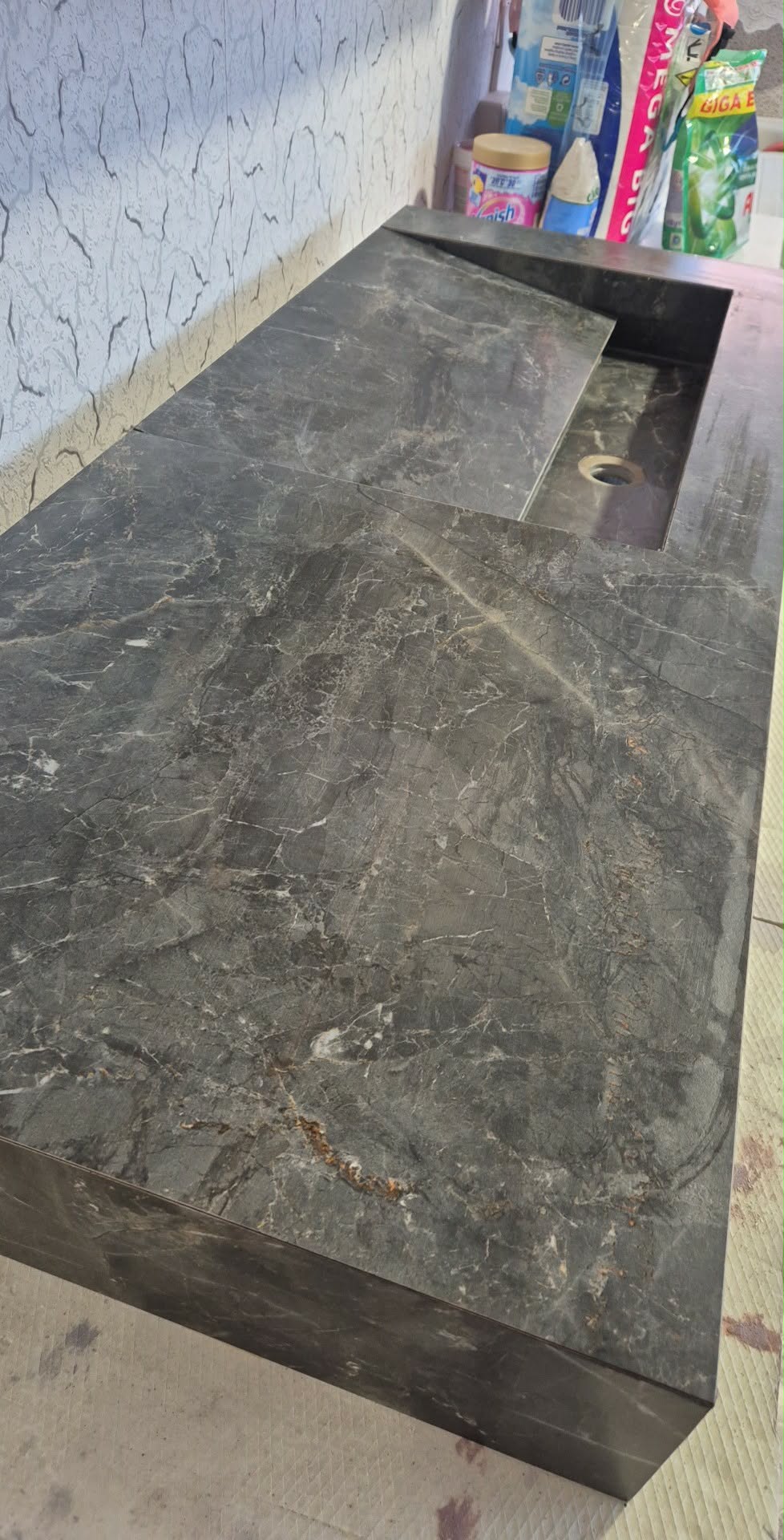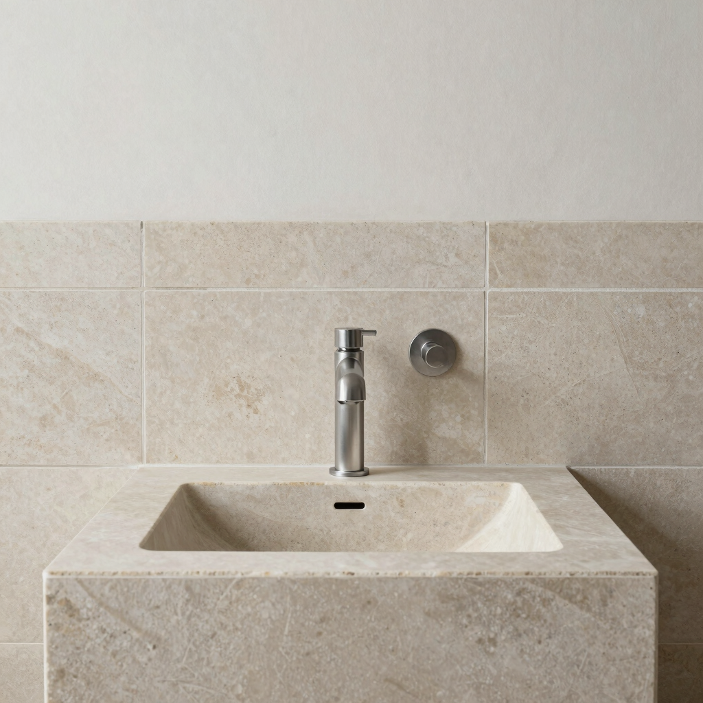 Kriauklė pagaminta iš akmens masės plytelių, derinant ją prie bendro vonios kambario dizaino.