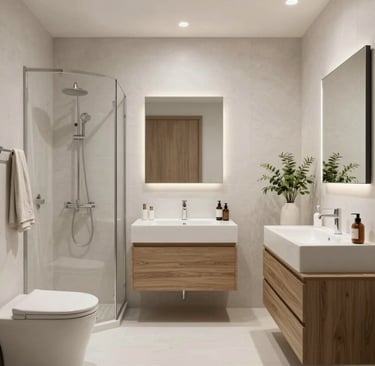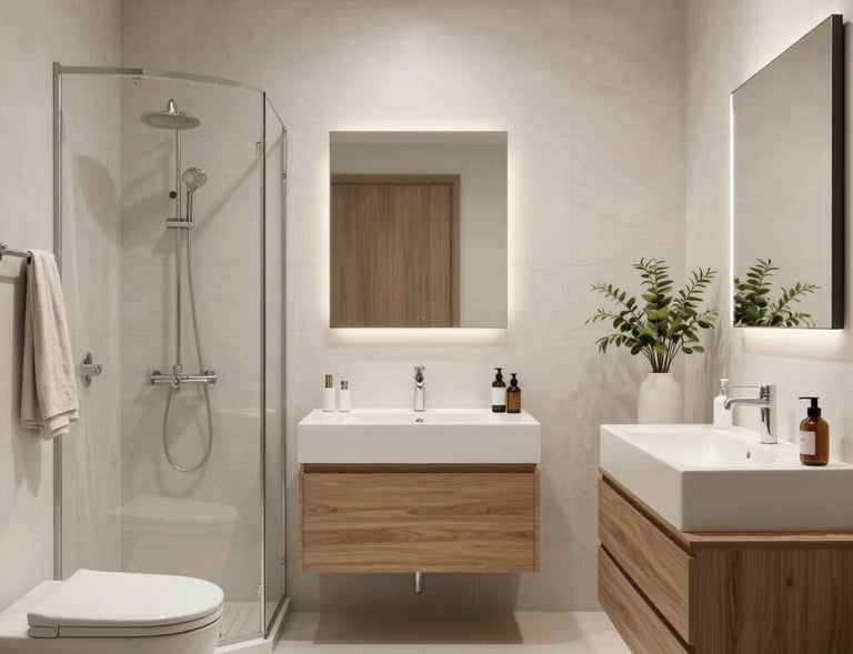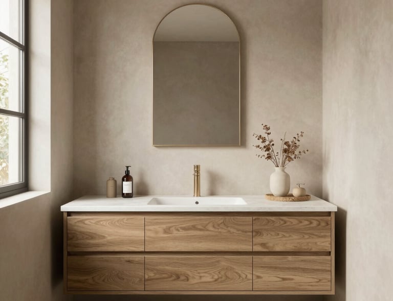 Sukurtas vientisas, estetiškai ramus vonios kambario vaizdas, kuriame visi elementai dera tarpusavyje.